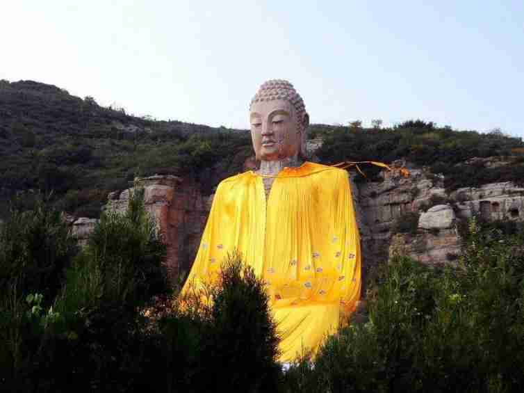 大佛的頭部很久以前就沒有了,現(xiàn)在的應(yīng)該是后修復(fù)上的,大佛的身體是易風(fēng)化的砂巖,有些地方風(fēng)化的厲害。據(jù)記載,公元551年,北齊文宣帝高洋鑿大巖為大佛,經(jīng)五個皇帝,二十余年。當(dāng)年唐高宗李治和皇后武則天來瞻禮大佛時,頂禮膜拜,贊嘆不已。