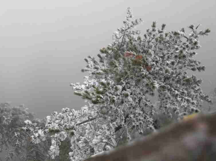湖南省衡陽市南岳衡山景區(qū),素有“神州最南賞雪佳處”的美譽(yù),因山頂處橫風(fēng)緣故,南天門至山頂南側(cè)未形成霧凇現(xiàn)象,北側(cè)卻霧凇成片。