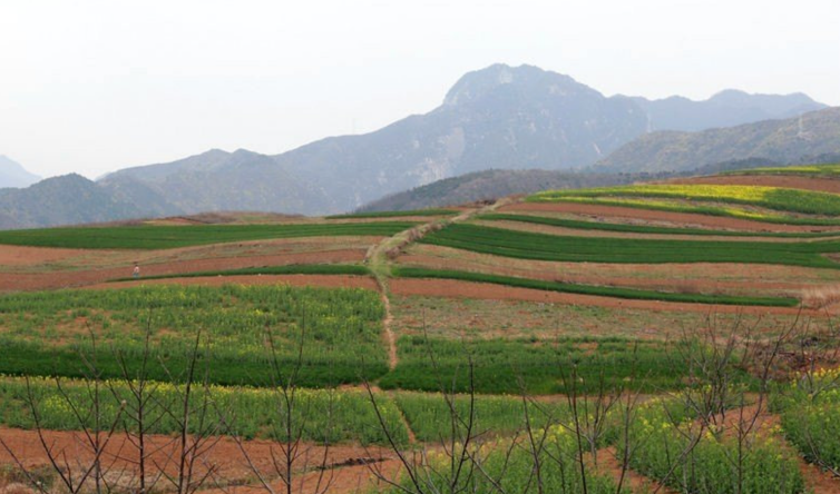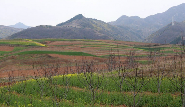 順著山坡下望,可以看到金色的楊樹林掩映中暗紅色的山崖,那是在關中地區不可多得丹霞地貌,形如紅色的云霞層層疊疊,風景獨特。