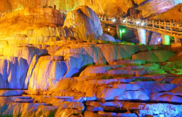 1、九鄉是溶洞地形,游客先乘手搖船在一條小峽谷里美美地轉了一圈,接著進入溶洞游覽。這里洞里有河、有瀑布、有疊水,濤聲在洞內回蕩,很有氣勢。石筍、石柱、石鐘乳形態各異,美不勝收。