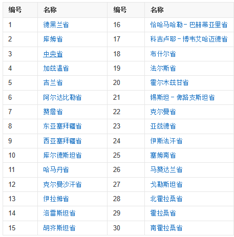 德黑蘭省、中央省、加茲溫省、吉蘭省、庫姆省、阿爾達比勒省、贊詹省、東亞塞拜疆省、西亞塞拜疆省、庫爾德斯坦省、哈馬丹省、克爾曼沙汗省、科吉盧耶-博韋艾哈邁德省、布什爾省、恰哈馬哈勒-巴赫蒂亞里省、法爾斯省、伊拉姆省、洛雷斯坦省、胡齊斯坦省、霍爾木茲甘省、錫斯坦-俾路支斯坦省、克爾曼省、亞茲德省、伊斯法汗省、塞姆南省、馬贊達蘭省、戈勒斯坦省、北霍拉桑省、霍拉桑省、南霍拉桑省。
